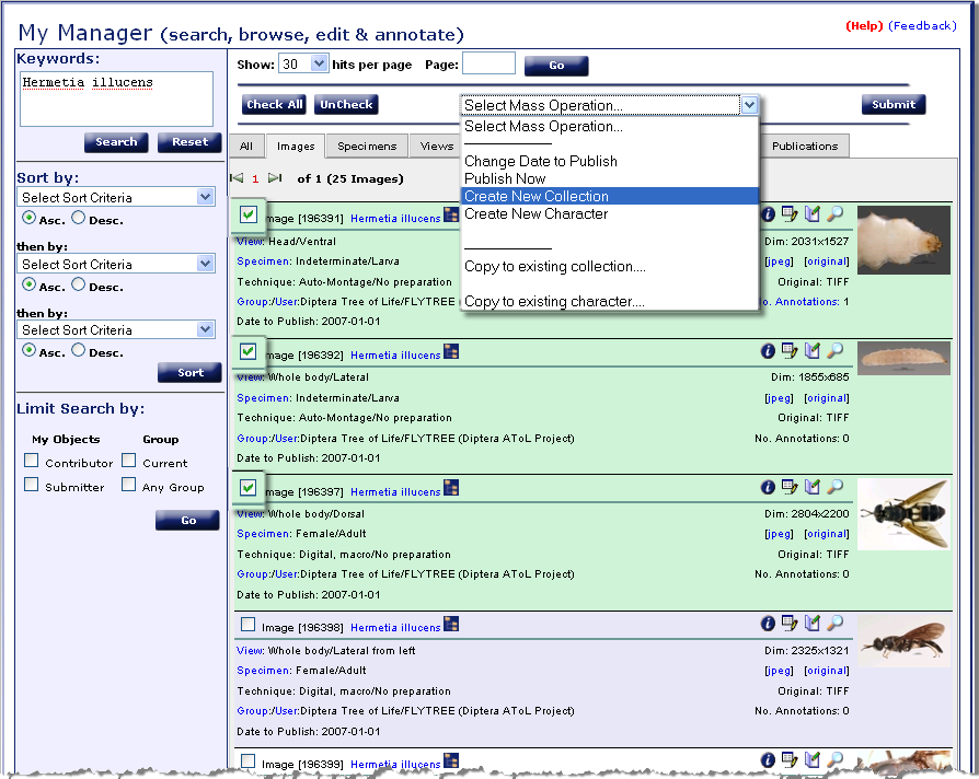 Add more images if desired or go to another tab in My Manager and add other objects (views, localities, publications, etc,) to the same collection to make a Mixed Collection. The Collection Title Hermetia Larva will now appear in the Select Mass Operation drop-down under Copy to existing collection in any My Manager Tab where this type of Collection is supported.